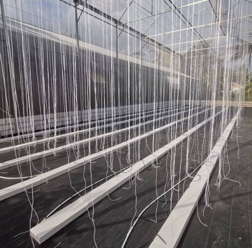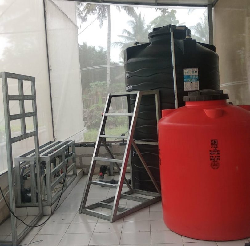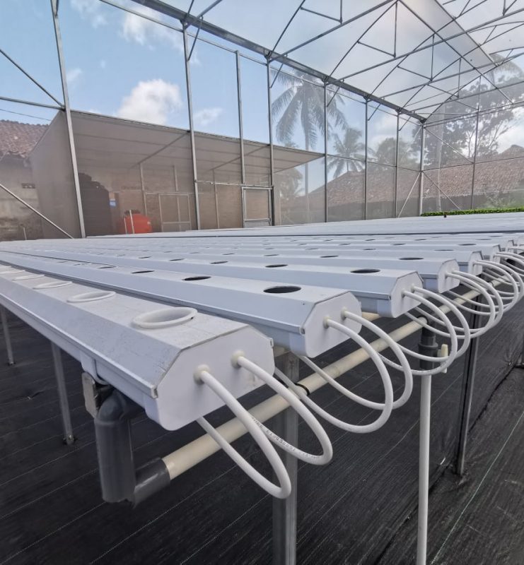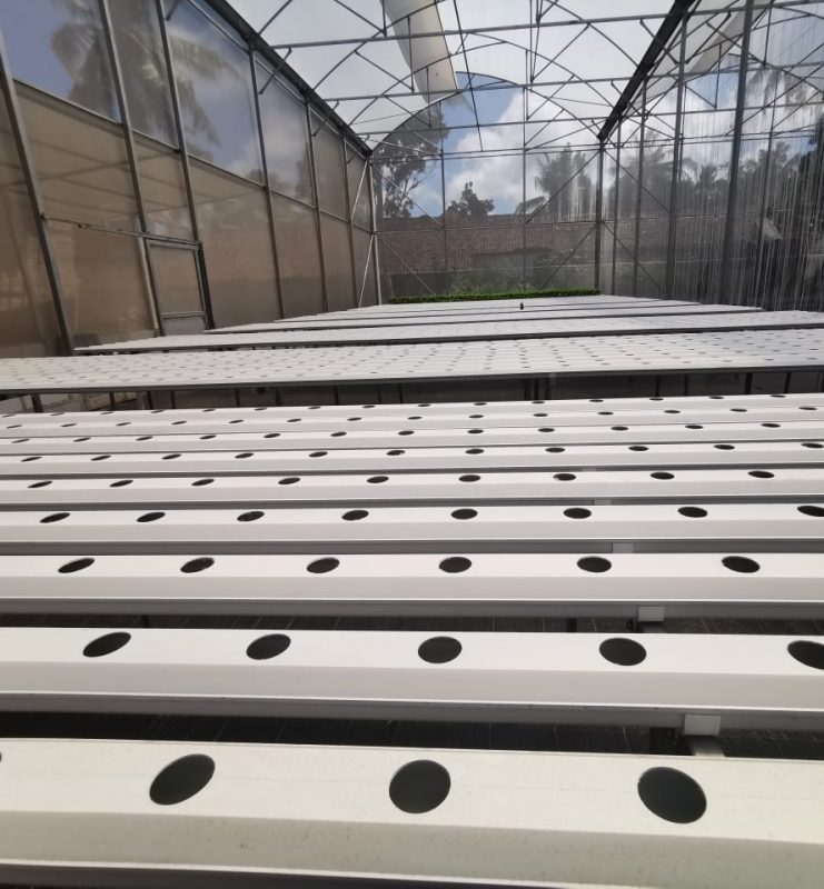 - Dimensi Greenhouse kami lebar 16 meter panjang 21 meter dengan 2 (dua) sistem di dalamnya, yaitu sistem NFT dan Sistem Fertigasi.