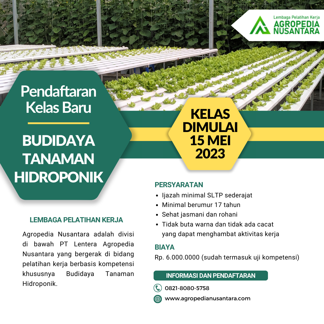 Perkembangan pertanian khususnya hidroponik di Indonesia semakin pesat, semakin bertumbuh dan berkebang kebun hidroponik skala komersial ( industri hidroponik ). Namun perkembangan ini tidak diimbangi dengan tersedianya sumber daya manusia yang terampil dan kompeten di bidang ini, sehingga produktivitas kebun juga menjadi kurang optimal. Kami mencoba menjawab tantangan ini dengan mendirikan Lembaga Pelatihan Kerja Agropedia Nusantara yang khusus mendidik tenaga kerja yang terampil dan kompeten dibidang hidroponik.